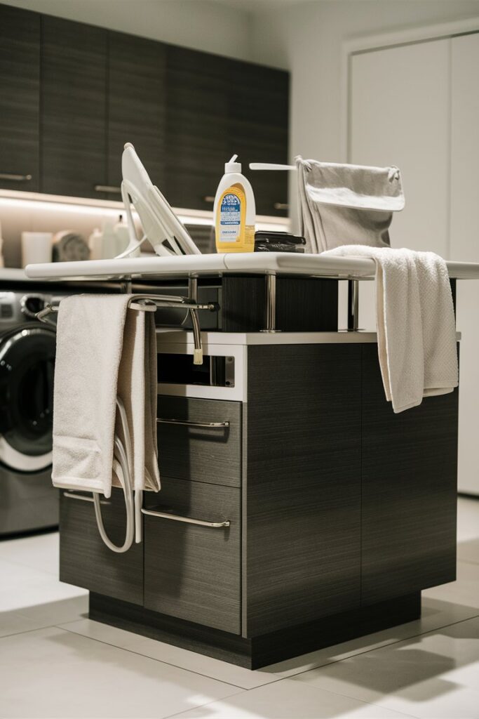 Say goodbye to bulky ironing boards with a fold-out version that tucks away seamlessly. This space-saver is hidden in a cabinet or wall recess, ready when you need it and out of sight when you don’t.