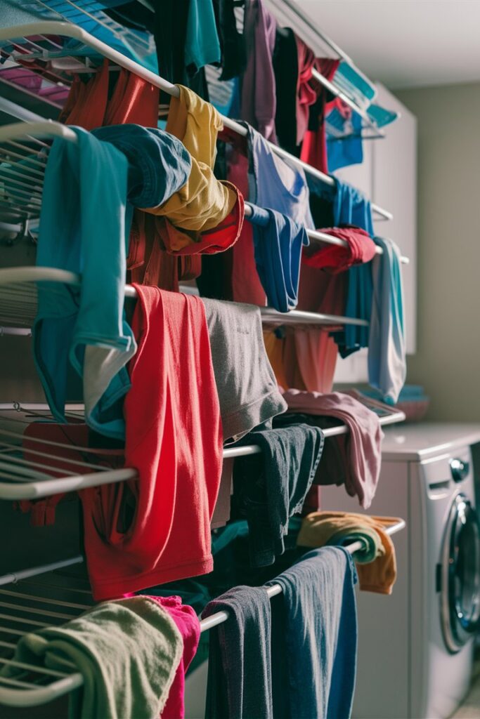 Wall-mounted drying racks fold flat against the wall when not in use, saving space and providing a convenient place to air-dry clothes without the clutter.