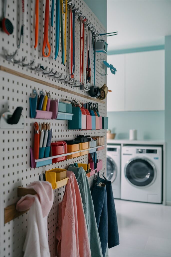 Pegboards are a versatile storage solution. Customize them with hooks and baskets to hold laundry tools and supplies, adapting as your needs change.