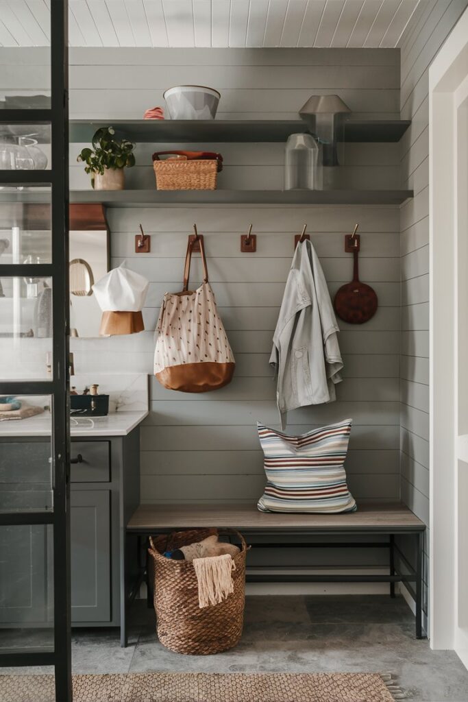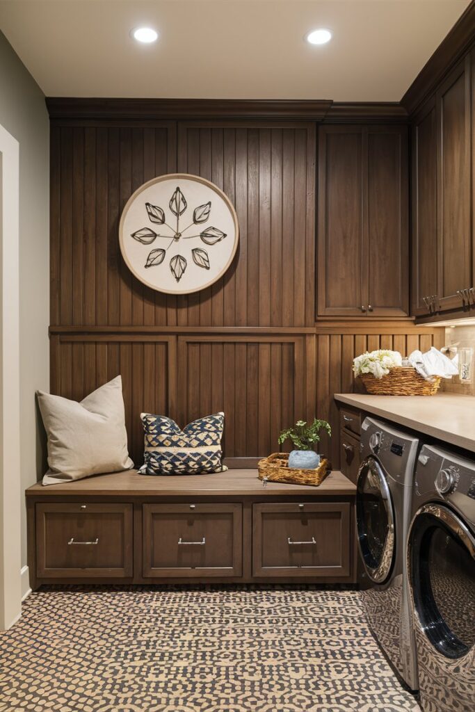 A built-in bench with storage underneath offers convenient seating and extra space for laundry supplies, shoes, or other items, combining style and function.