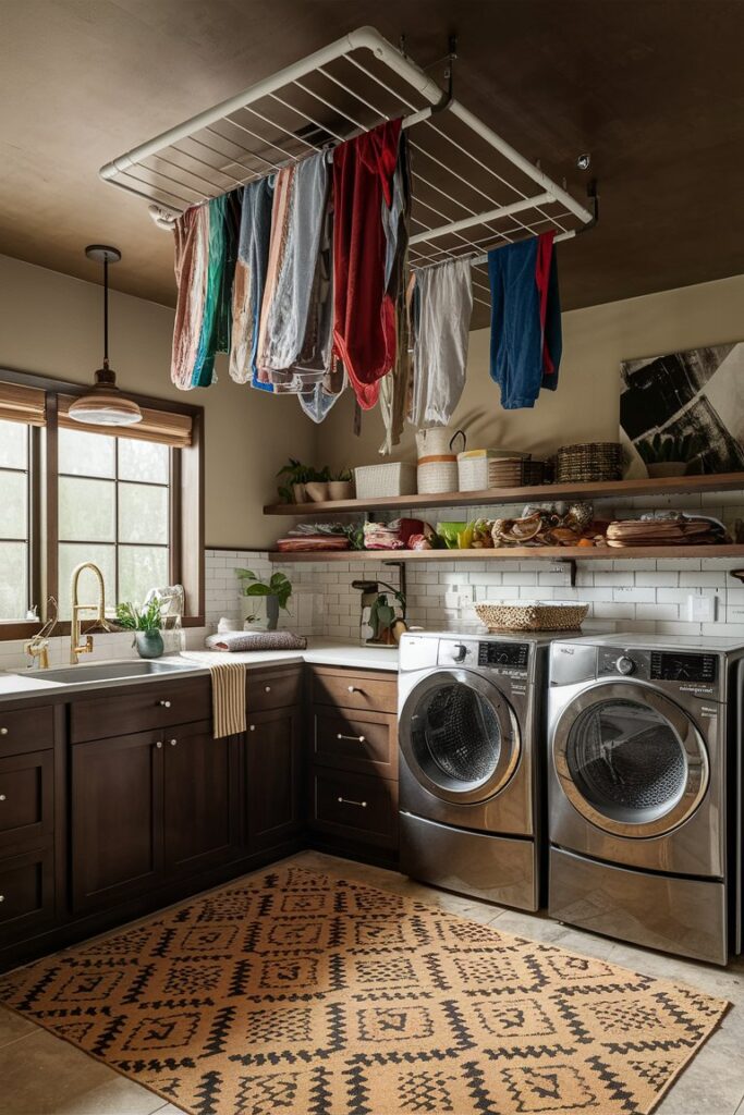 Make use of vertical space with a ceiling-mounted drying rack. Lower it when needed and raise it out of the way when not in use, keeping your laundry room clutter-free.