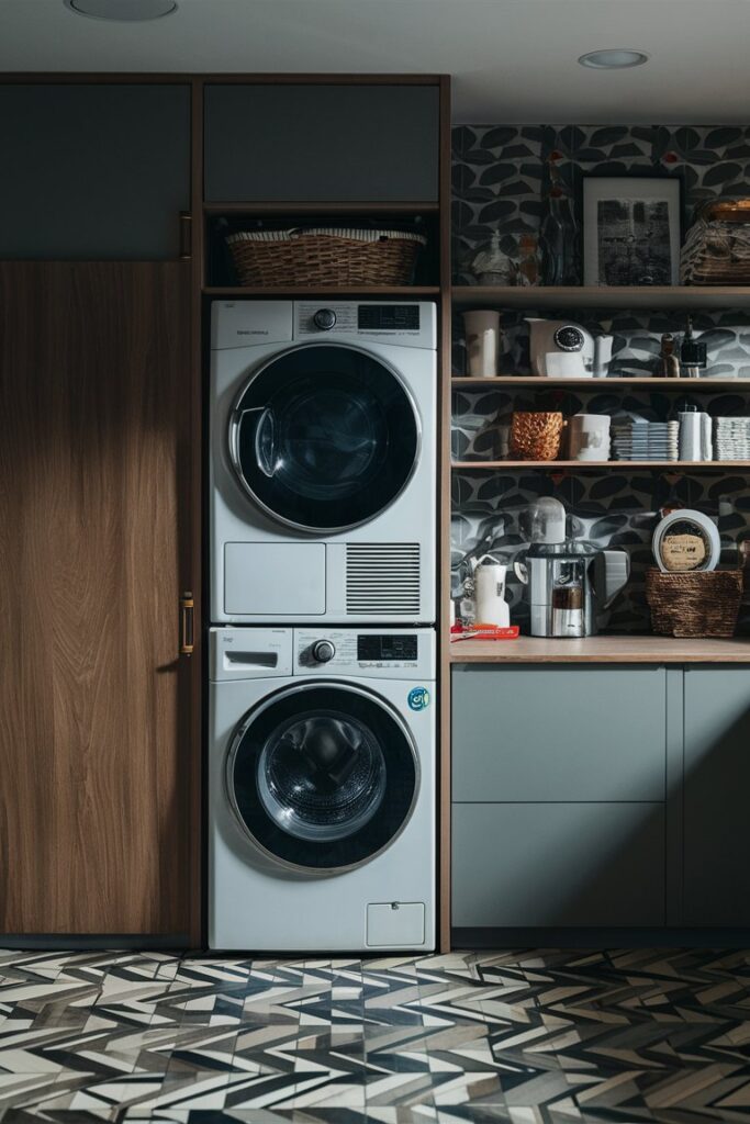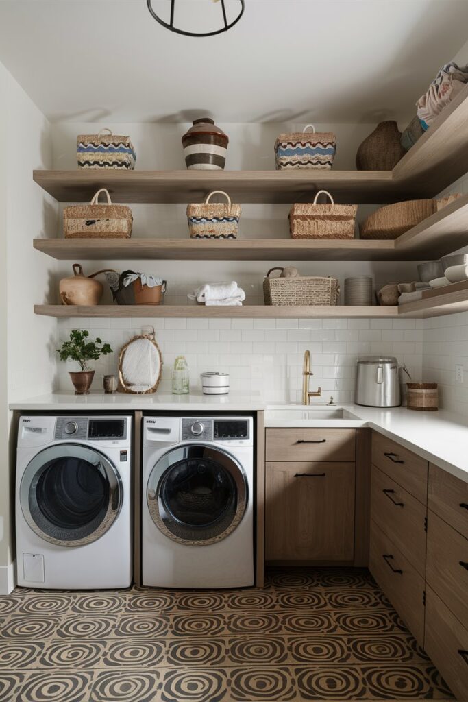 Who says you can’t have style and storage? Install shelves above your washer and dryer to keep detergents, softeners, and more within reach. Decorative baskets add a touch of charm while keeping smaller items neatly organized.