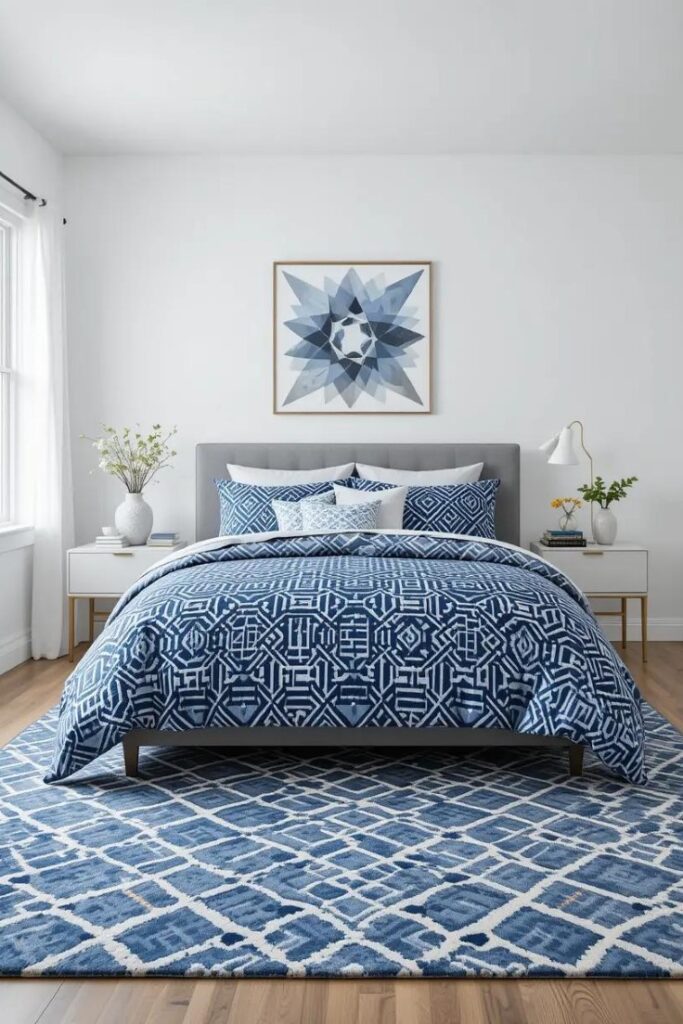 Geometric patterns add a modern and structured look to a bedroom. Try a blue and white patterned area rug, throw pillows, or bedding to introduce visual interest while keeping the color scheme cohesive.