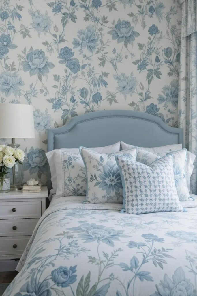 Floral patterns bring softness to a blue and white bedroom. Whether it’s wallpaper, bedding, or decorative pillows, choose a delicate floral print in soft blues and whites for a refined touch.