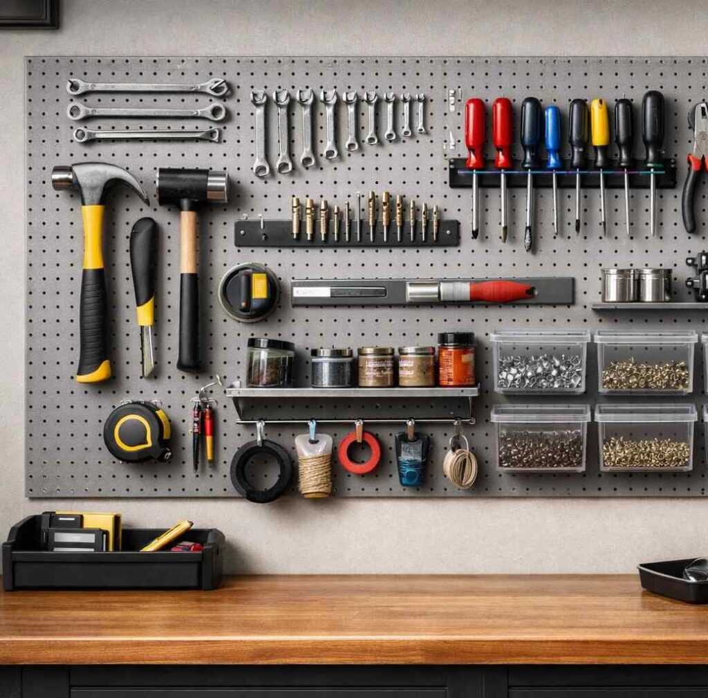 Pegboard installed directly above and around a workbench keeps frequently used tools within arm’s reach during projects. The layout can follow the shape of the bench and extend onto adjacent walls. This configuration reduces time spent walking to a separate storage area mid-task.